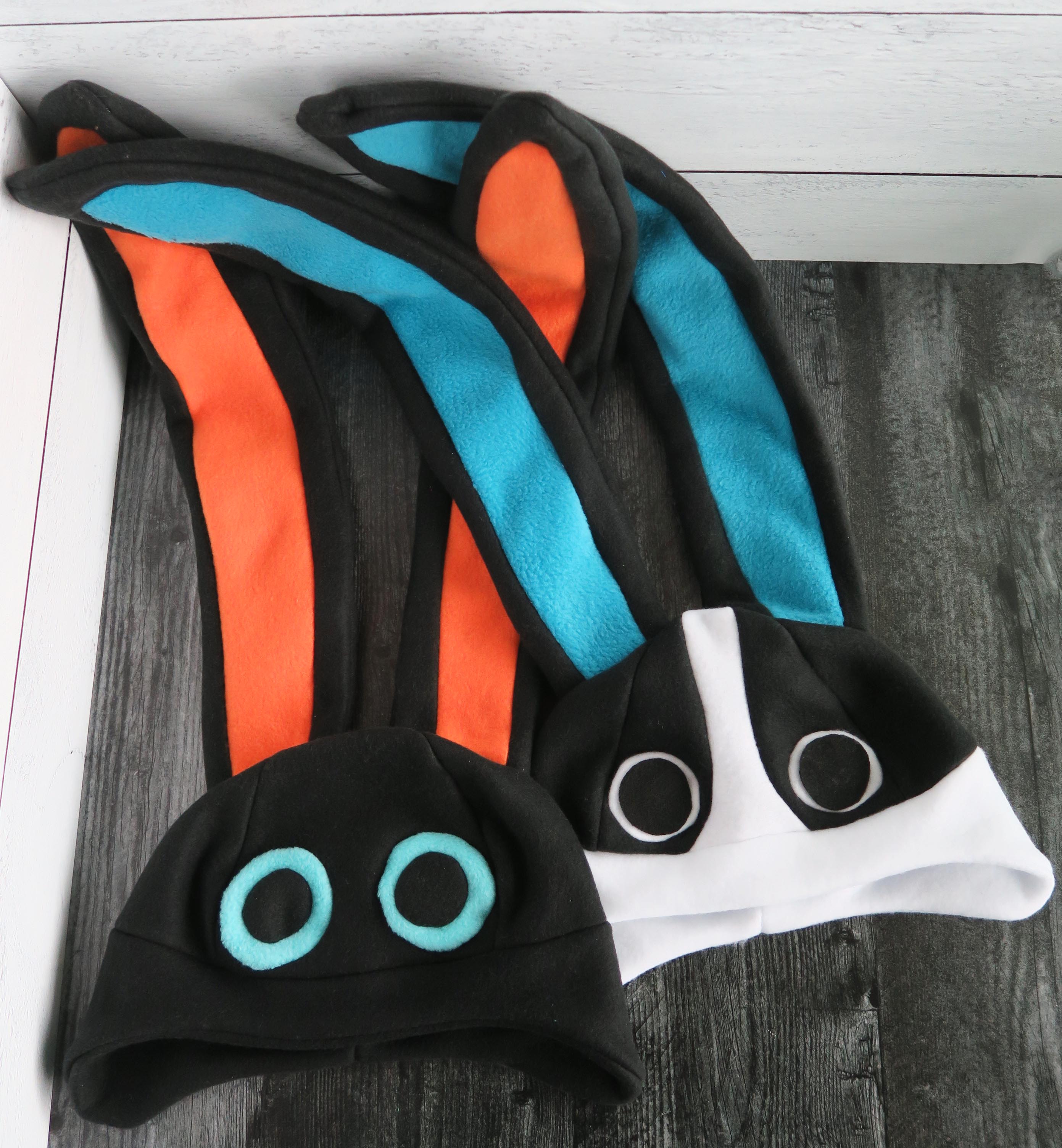 These Dotty hats are made from fleece, felt/vinyl, and interfacing.